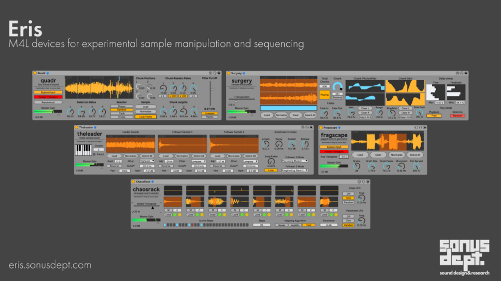 Eris is a collection of five Max for Live devices oriented towards the manipulation of samples and loops in creative and unusual ways. The devices currently featured are: