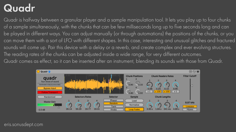 Quadr: four slices of sound, moving across the sample in different ways and with different speeds. It can lead to very different results, from noisy glitches to more recognizable outcomes.