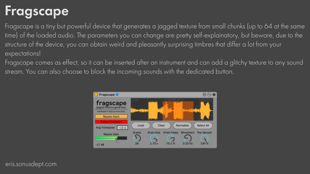 • Fragscape: a tiny device that creates granular and jagged textures from parts of a sample.