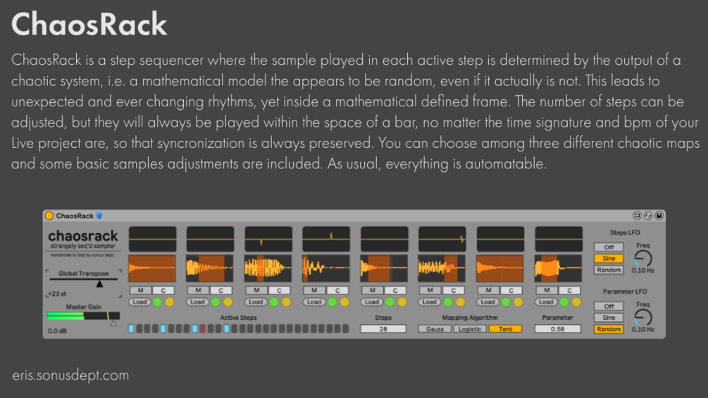 • ChaosRack: a step sequencer and sample rack where the sample selection for each step is decided by the output of a chaotic map. Use this for unpredictable rhythms or sample sequences!