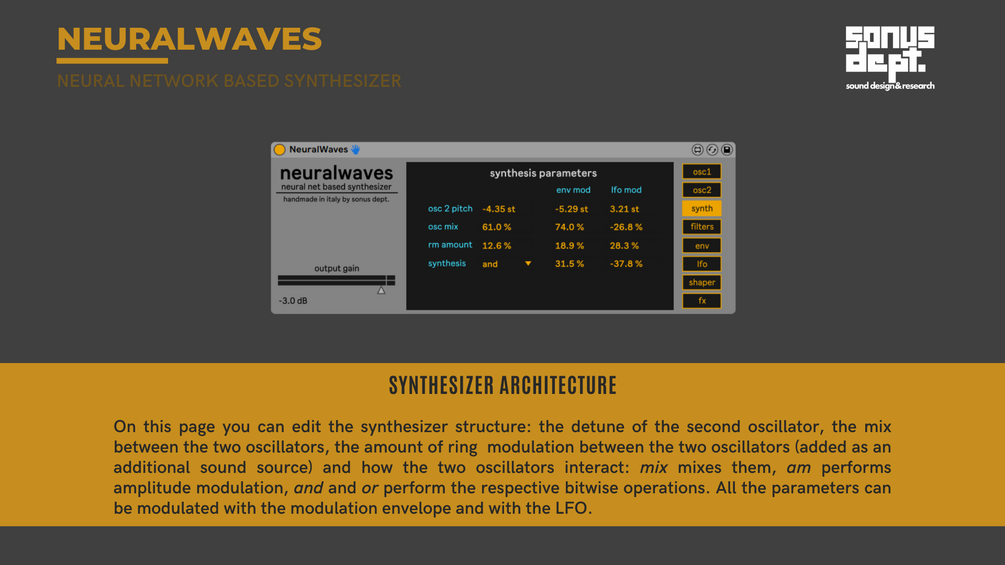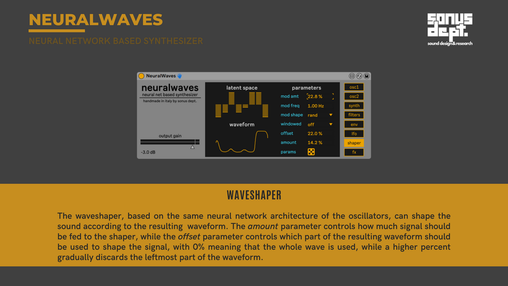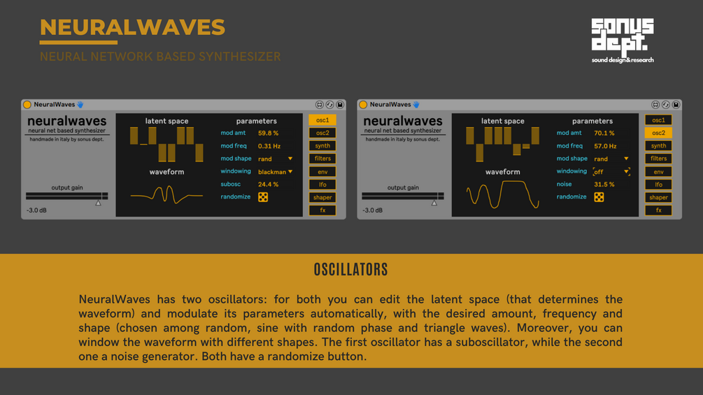 NeuralWaves is a synthesizer that uses a custom-made neural network, trained on thousands of waveforms, to generate the waves for the oscillators, the LFO and the waveshaper. It is based on the same in-house developed neural network used for Neuraloot.