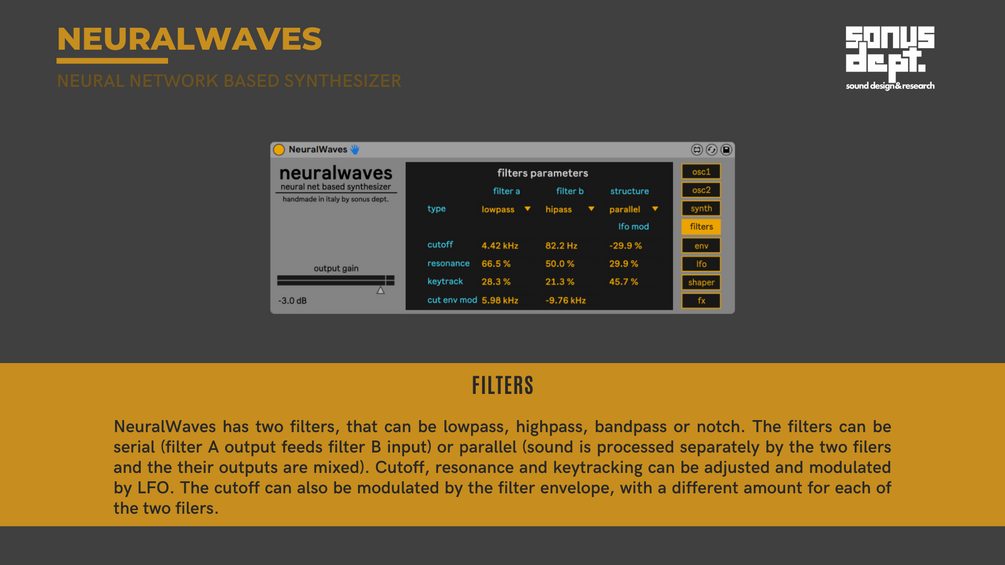 NeuralWaves does not end with this powerful neural network, though: different synthesis algorithms, a double filter, modulation envelopes and five internal effects allow it to shape the sound up to the finest level of detail. Also the LFO and the waveshaper are based upon the same customizable neural network.